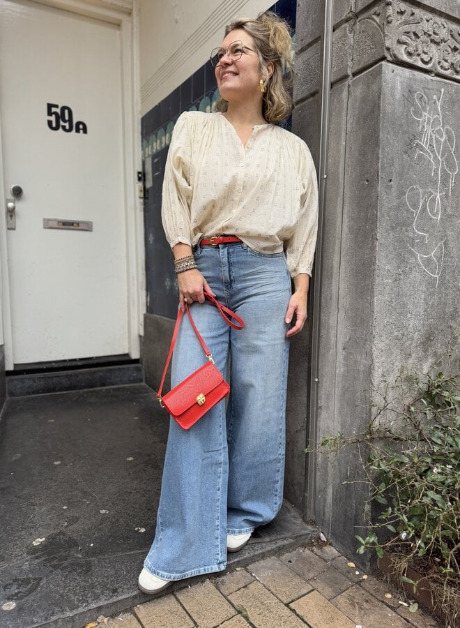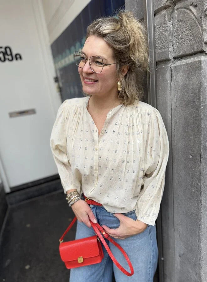 Elegante blusa blanca y azul, perfecta para un look fresco y refinado. Confeccionada en un tejido ligero y transpirable, garantiza comodidad y facilidad de movimiento durante todo el día. Su diseño atemporal funciona igual de bien para los negocios que para los looks informales. Fácil de combinar con vaqueros, faldas o pantalones de vestir. Un imprescindible de la moda para dar un toque de sofisticación en cualquier estación.