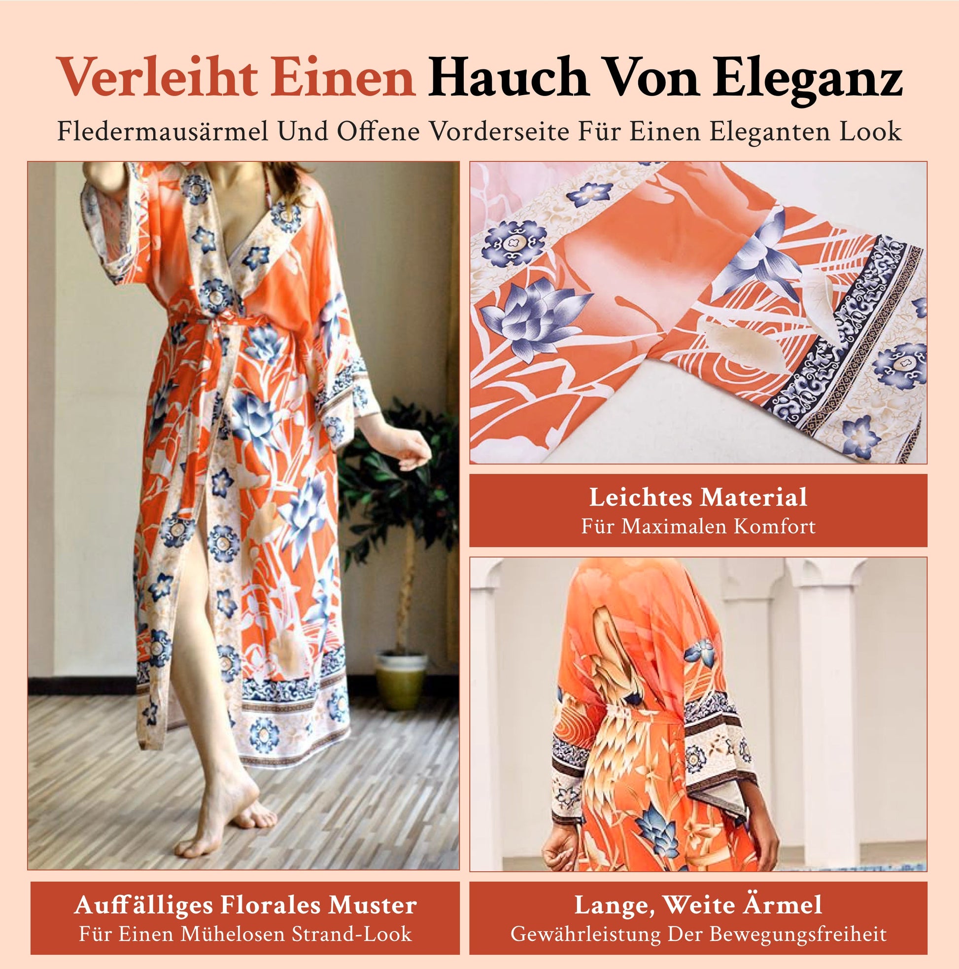 Añade un toque de lujo a tu look de verano con este vestido floral ligero en tonos rojos y naranjas, ideal para días soleados en la playa o junto a la piscina. Su diseño elegante con mangas murciélago y apertura frontal ofrece estilo y comodidad al mismo tiempo.